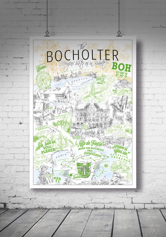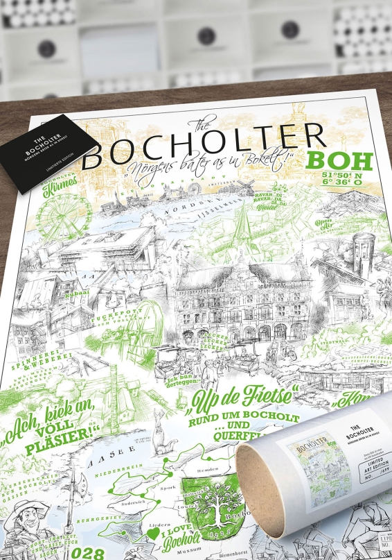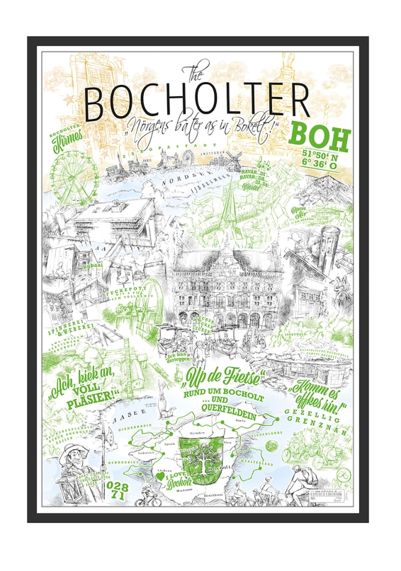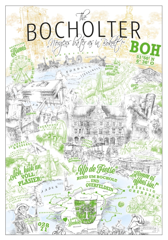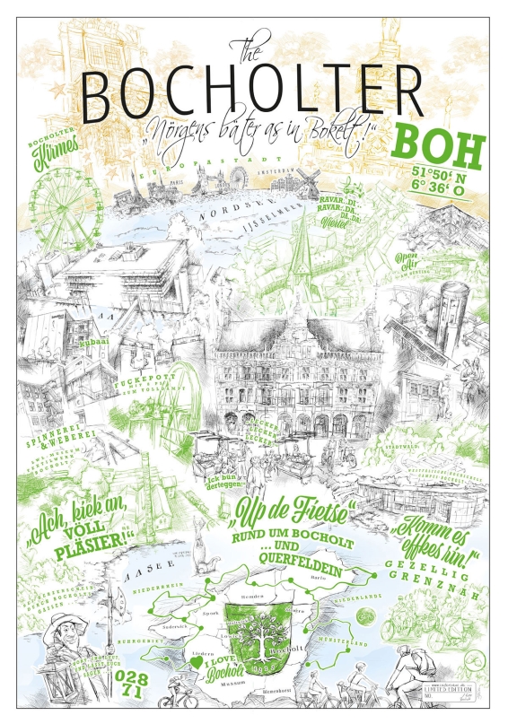 "The Bocholter - Nörgens bäter as in Bokelt!". Wie immer als limitierte Auflage mit Editionsnummer. Inspiriert vom "The New Yorker", dem von Saul Steinberg gezeichneten Titelbild der Ausgabe März 1976 des gleichnamigen New Yorker Stadtmagazins.