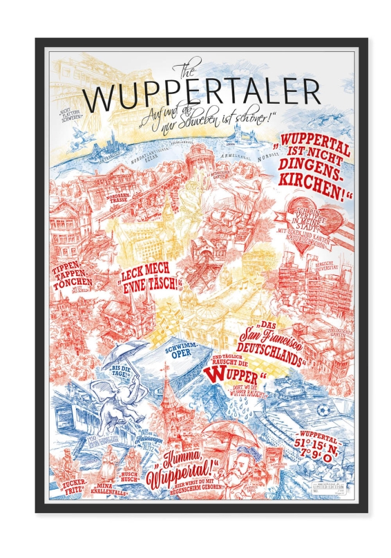 "Wuppertal: Leck mech enne Täsch!" Schwebebahn und Tippen-Tappen-Tönchen: Ein Wuppertal-Bild, inspiriert vom "The New Yorker", dem von Saul Steinberg gezeichneten Titelbild der Ausgabe März 1976 des gleichnamigen New Yorker Stadtmagazins. Sprüche und Slangs in unseren Städtepostern sind nach "Gehör“ geschrieben, um das Gesprochene lautmalerisch wiederzugeben. "Dort, wo die Wupper rauscht!"
